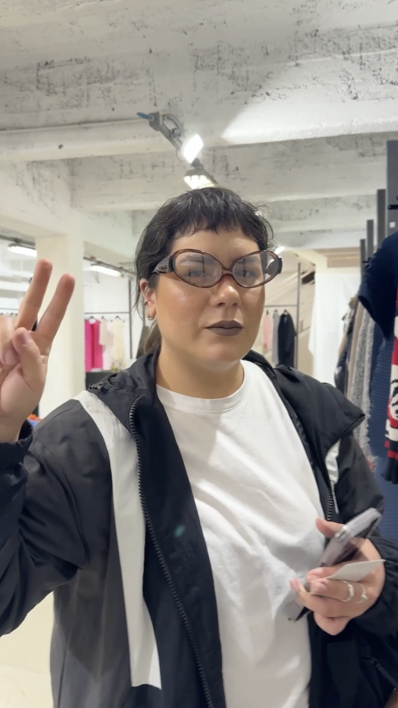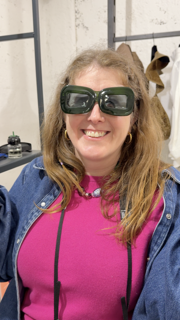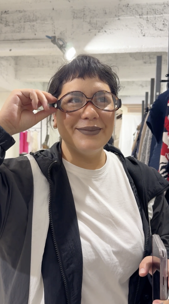 Una de las marcas donde más tiempo pasamos fue en Henrik Vibskov, las dos nos probamos anteojos, los de Lau se podían usar de dos formas! Una belleza.